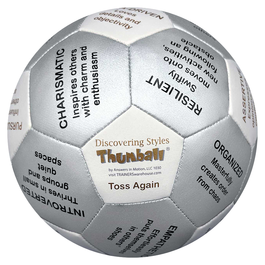 Used as a complementary resource to any personality-type tool, the Discovering Styles Thumball is one of the best collaboration activities for teams. The Thumball explores players' work and management styles and helps players recognize the various personality styles in the workplace, become familiar with new terminology, refine their ability to categorize traits into personality types, and explore ways to leverage the strengths of each style.